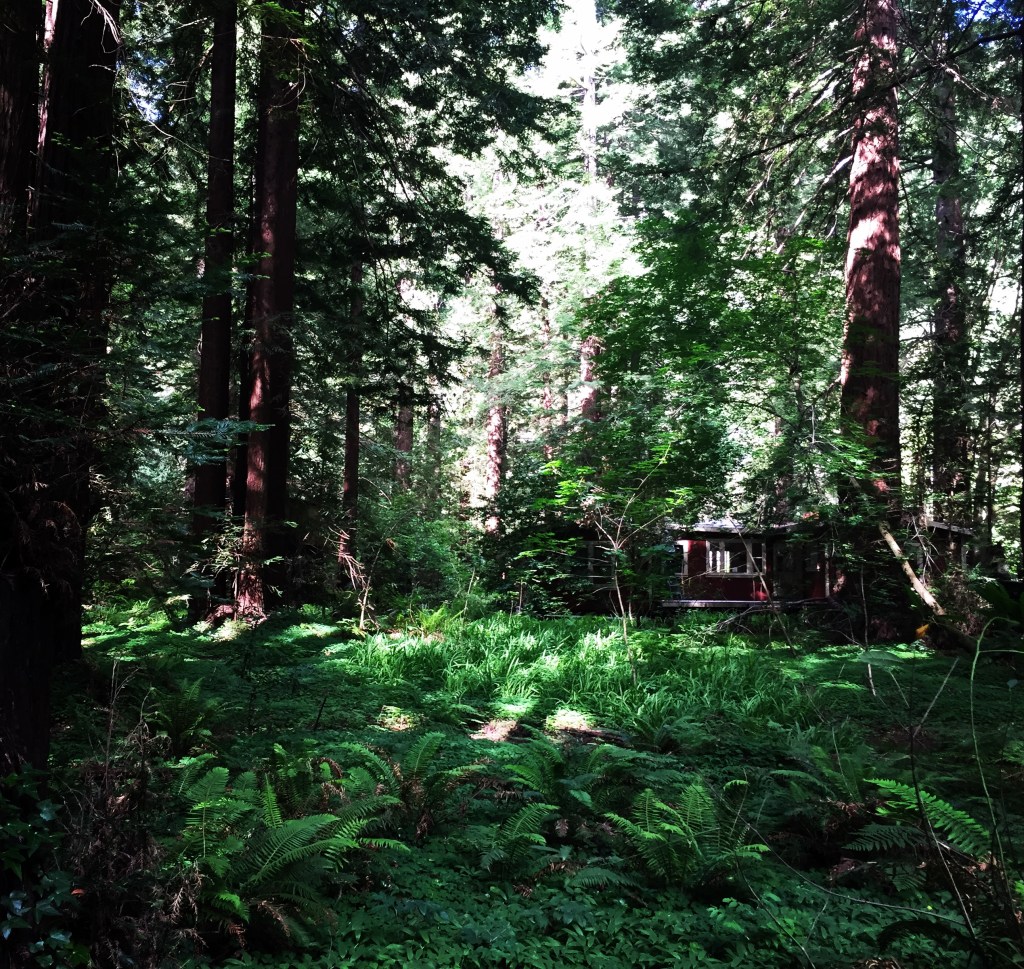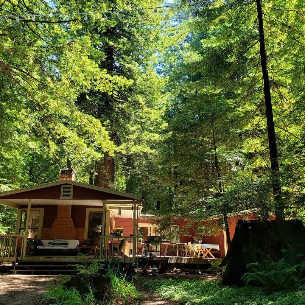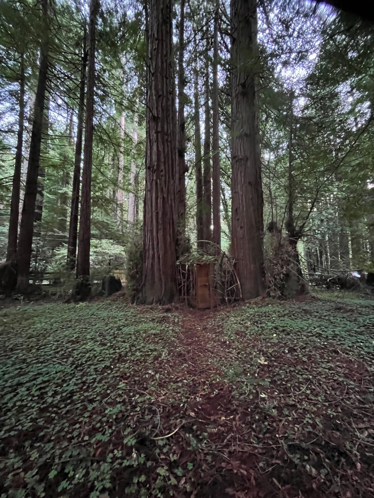 Located on two flat acres next to a creek, the house sits in the middle of a redwood grove. A tree house sits atop an old stump and has a hidden entrance. If you want to camp there are plenty of nooks and crannies to pitch a tent.