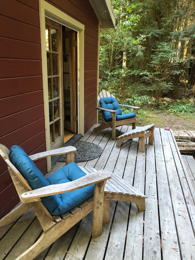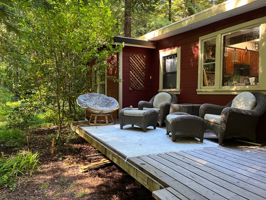 The smaller cabin (or Love Shack) is a single room office with french doors opening onto a private deck overlooking the creek. It has a fold out double futon, reading corner, desk and cold water sink.